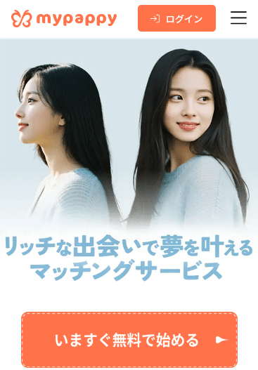 mypappy![]() | 詳細を確認 | 非公開 | ━ | 男性 9,800円/月~ 女性 完全無料 | 男性 40代~70代 女性 20代~30代 | 記載なし | ハイクラス |