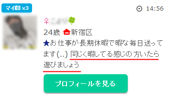 - すぐに会いたい・遊びたいなど、軽い誘い文句を使用している